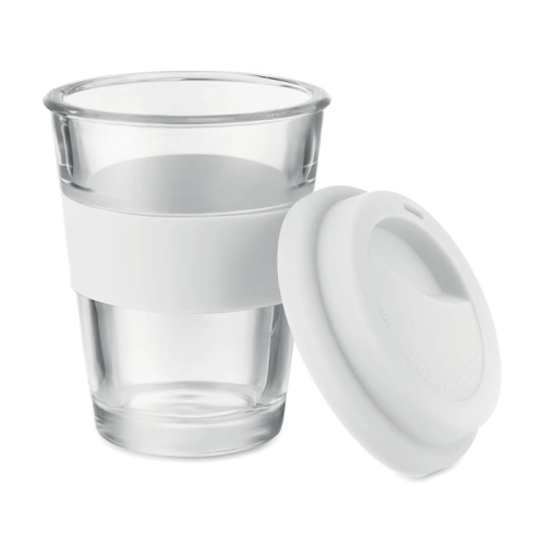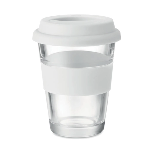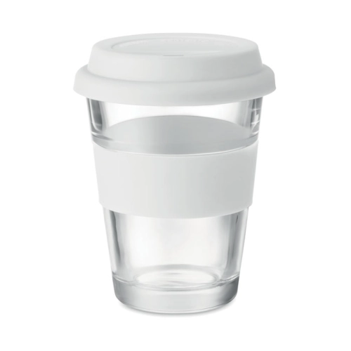 Glass tumbler with silicone lid and grip. Capacity 350 ml. As this is a single wall mug heat transfer can still occur.