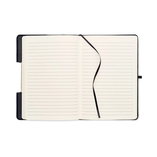 A5 notebook with 600D RPET hard cover with bamboo detail with a smartphone stand function. Casebound. 160 lined pages (80 sheets). 70 gsm recycled paper. Matching elastic closure strap, ribbon page-marker and pen holder. Take this office essential with you to your next meeting. Having a remote meeting? Fold open the phone holder and put in your device so you don't have to hold it yourself. FSC®-certified | FSC MIX CREDIT, P7.1, FSC-C213206