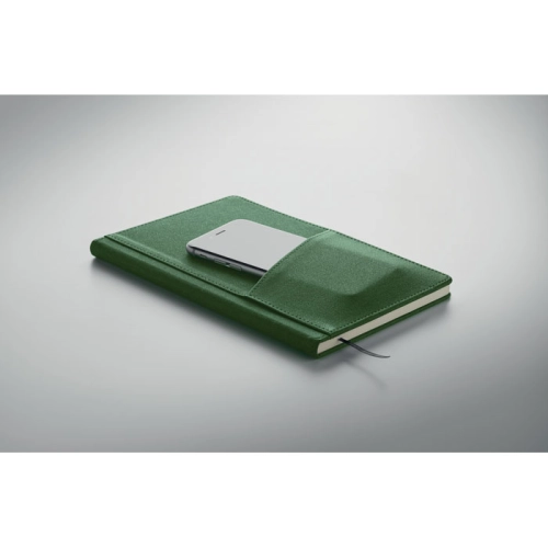 A5 notebook with PU hard cover with front phone pocket. Case bound. 160 recycled paper lined pages (80 sheets). Matching ribbon bookmark. FSC®-certified | FSC MIX CREDIT, P7.1, FSC-C213206