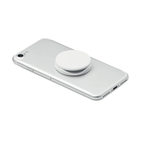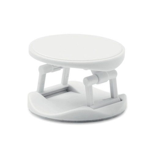 Round shaped foldable phone accessory in ABS with two functions: phone stand and holder. It has 3M sticker on the back.