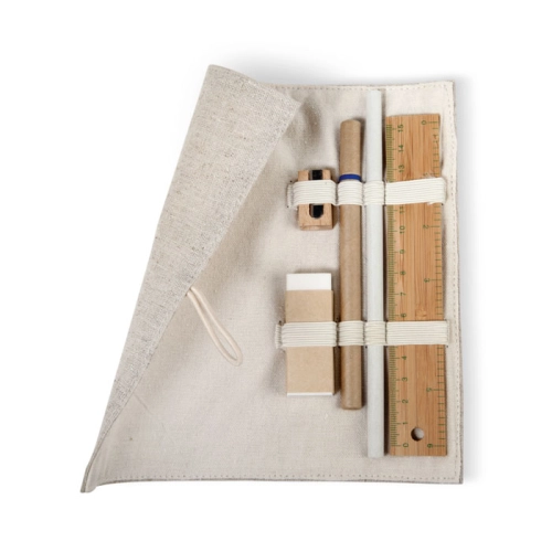6 pieces stationery set. Include jute and cotton pouch, bamboo ruler, wooden sharpener, eraser, paper pencil, ball pen with cardboard barrel and blue ink. Bamboo is a natural product, there may be slight variations in colour and size per item, which can affect the final decoration outcome.