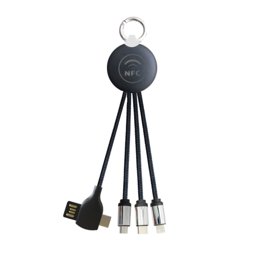 3-in-1 charging cable with 3 different connectors, micro-USB, type-c and double sided connector. Suitable for iOS and Android devices. Ideal for full colour personalisation.