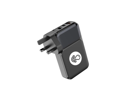 Power bank 5000 mAh in recycled ABS. Capacity for smartphone use, Output: 1 x Type-C, 2 x Type-A & 1 x Type-B. Input: 2-in-1 Type C & Type-A.