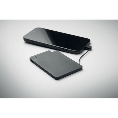 Card sized power bank 2500 mAh capacity in ABS with built-in cables. Powerbank sticks to magnetic featured iOs phones. Input: Type-C and output Type-C and IOS devices compatible.