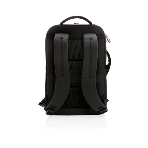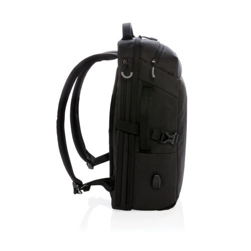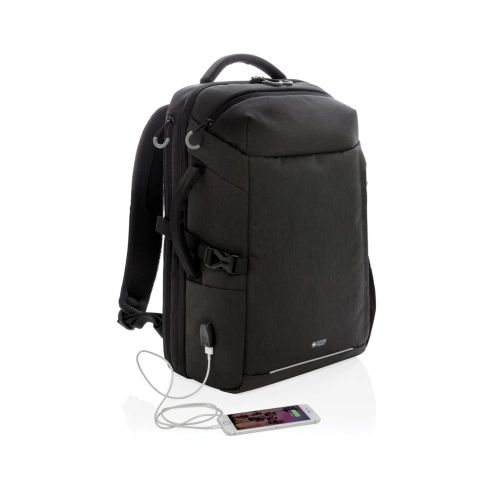 This carry-on travel backpack is intended for overnight or weekend trips. It is designed with a padded 17" laptop compartment to protect your device. This style has the capacity of a trolley without the weight of the wheels and handle, plus using a backpack makes you more mobile, hands-free and simplifies your travel experience. Leave your wheels at home and travel easily. Including trolley strap, water bottle side pocket and USB A output. Top quick access pocket, front zippered pocket and RFID protected pockets. With AWARE™ tracer that validates the genuine use of recycled materials. Each bag has reused 35.5 0.5L PET bottles. 2% of proceeds of each Impact product sold will be donated to Water.org. PVC free.